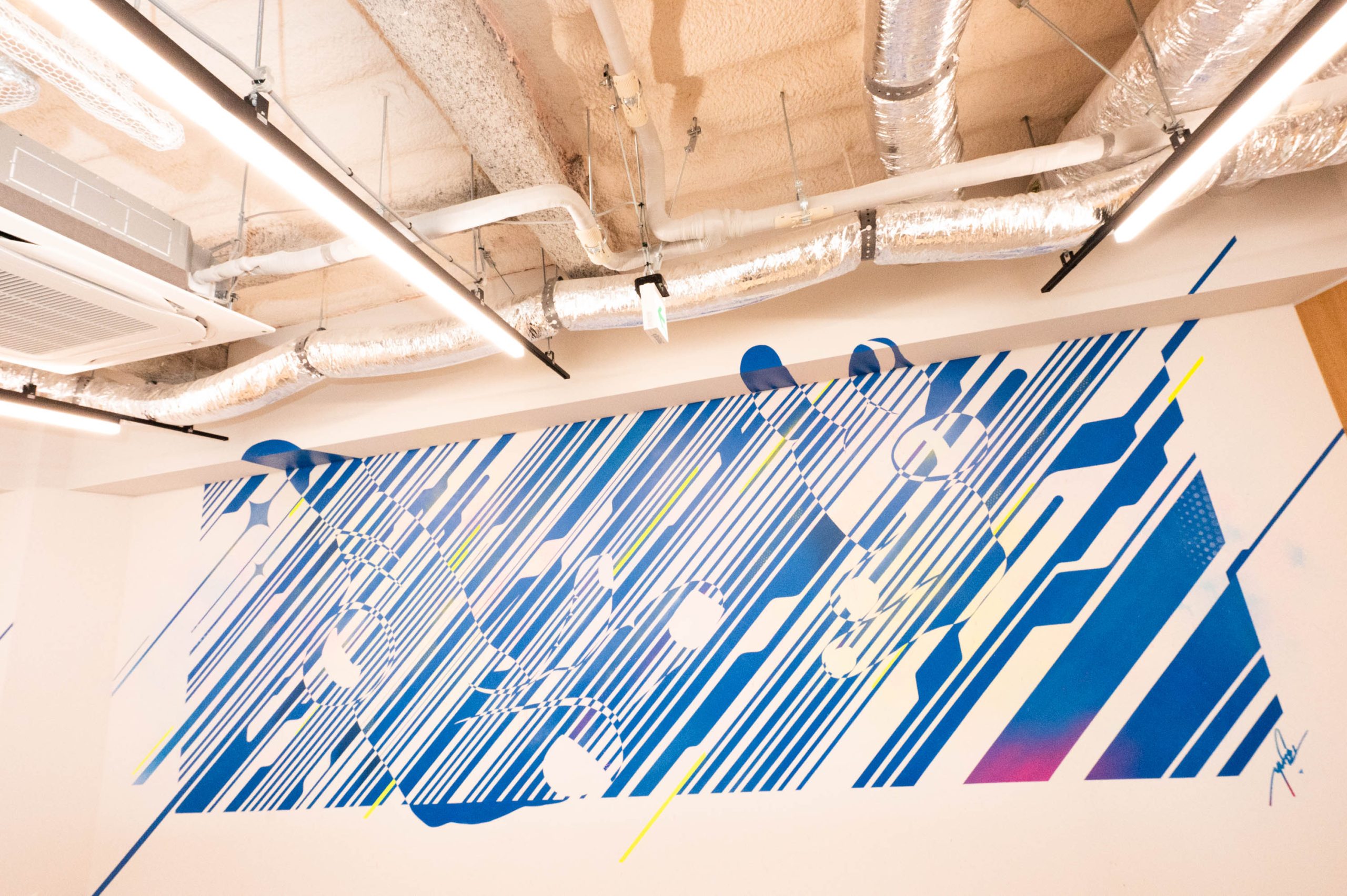松本:それから、他のSreed物件の入居企業さんにもご協力いただいて、実際にインタビューをさせてもらったんです。アーティストさんと一緒に、入居企業さんの会議室をお借りして。「オフィスにアートがあるってどう思いますか?」「普段どういう風に働かれてるんですか?」とか。そういうのを全部インスピレーションにして、最終的に描いていただく。