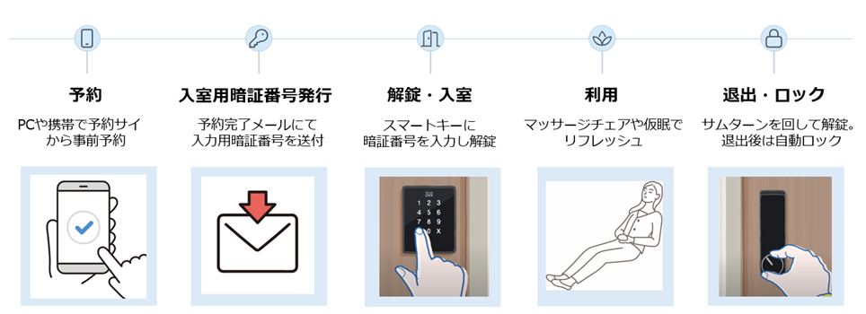 恵比寿ガーデンプレイスに設置した個室ブースと、利用手続および精算を行う決済システムを提供し、利用状況の分析、運営方法の検証を実施します。第1回実証実験に引き続き、ブース内には高性能なマッサージチェアを完備した個室空間での休憩ブースを提供します。前回の実証実験時にいただいたご要望を踏まえ、お客様の利用ニーズに対応できるよう、メニューを3パターン用意しました。また、予約システムと連携したスマートキーをリニューアルし、予約時に送付される4桁の暗証番号を入力するだけで簡単に入室できるように変更することで更に使いやすいサービスとして展開します。