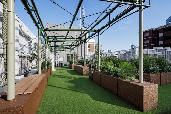 屋上は、従来の限定的な利用形態から転換し、気軽に立ち寄れる開放的な空間へと刷新しました。床面には人工芝を採用し、すっきりとした短めの芝丈とすることで、歩きやすく清潔感のある仕上がりとしています。また、既存の花壇造作を活用したベンチを設置するとともに、プランターには視線の高さに葉先がかかる樹種※を選定。あわせて室外機側フェンスを自然に目隠しする高さとすることで、景観性と快適性の向上を図りました。