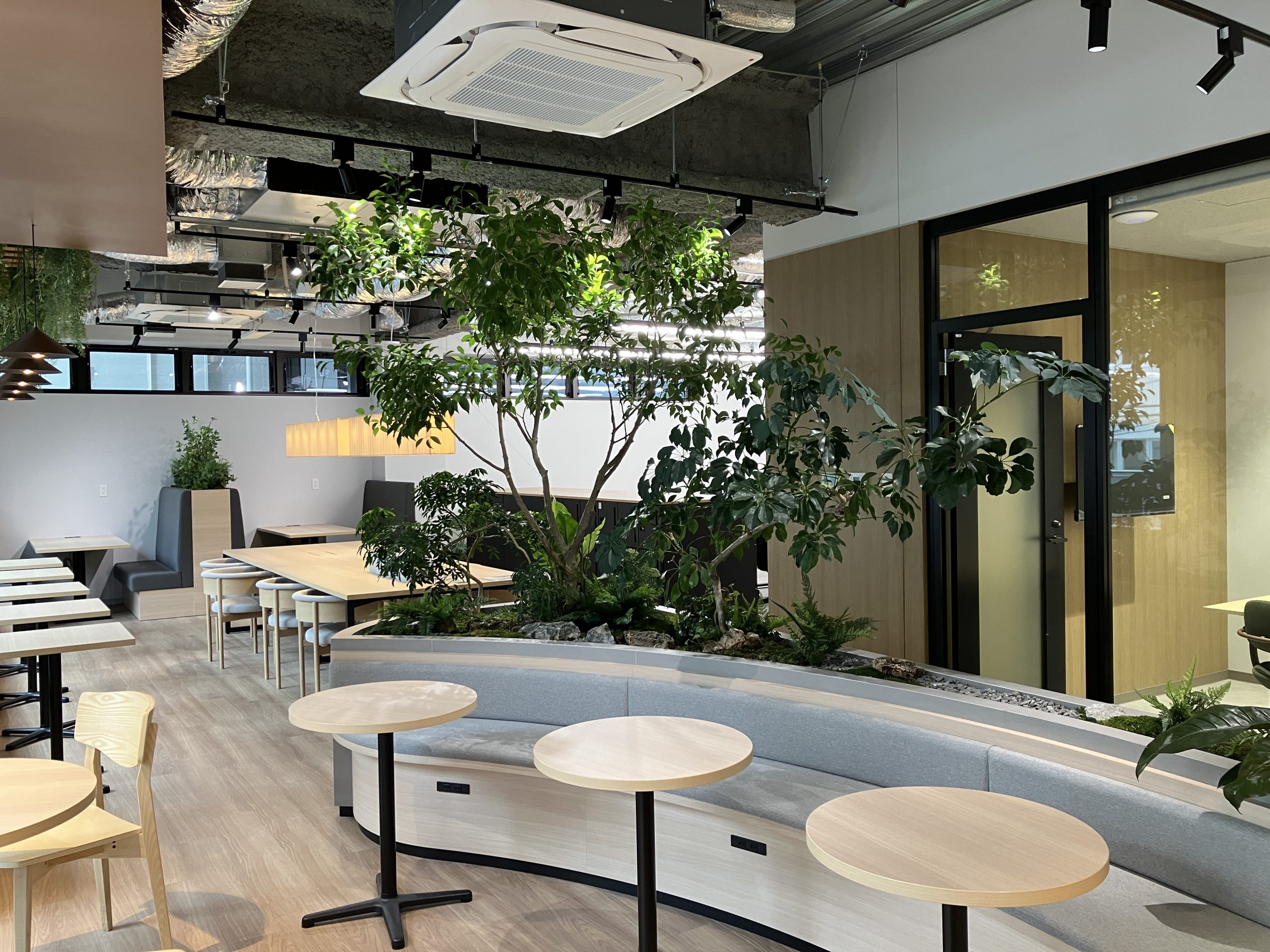 本物件では、オフィス空間に豊かな緑を取り入れることで、入居者の心身のリフレッシュだけでなく、集中力や創造力の向上にも寄与する環境づくりを目指しました。象徴的な存在としてベンジャミンをシンボルツリーに採用したほか、ルーバー植栽、造花アレンジなど、多様なグリーンを組み合わせることで、空間全体に自然の潤いと立体的な演出を施しています。
