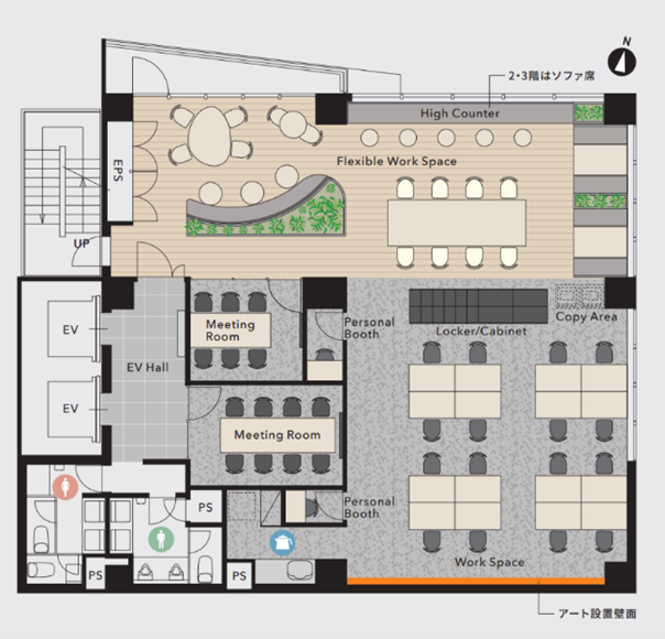 建物内には、まちににぎわいを創出する飲食店舗に加え、スタートアップや成長企業の働き方を支えるセットアップオフィスおよびハーフセットアップオフィスを整備。スピード感ある事業成長や柔軟な組織運営に寄り添うワークプレイスとして、入居後すぐに利用できる機能性を備えた空間を提供します。特に、フルセットアップフロアでは、豊かな緑とフロアごとに異なるアーティストの作品を設置することで、「ひらめき」が生まれる創造的な環境を実現しています。