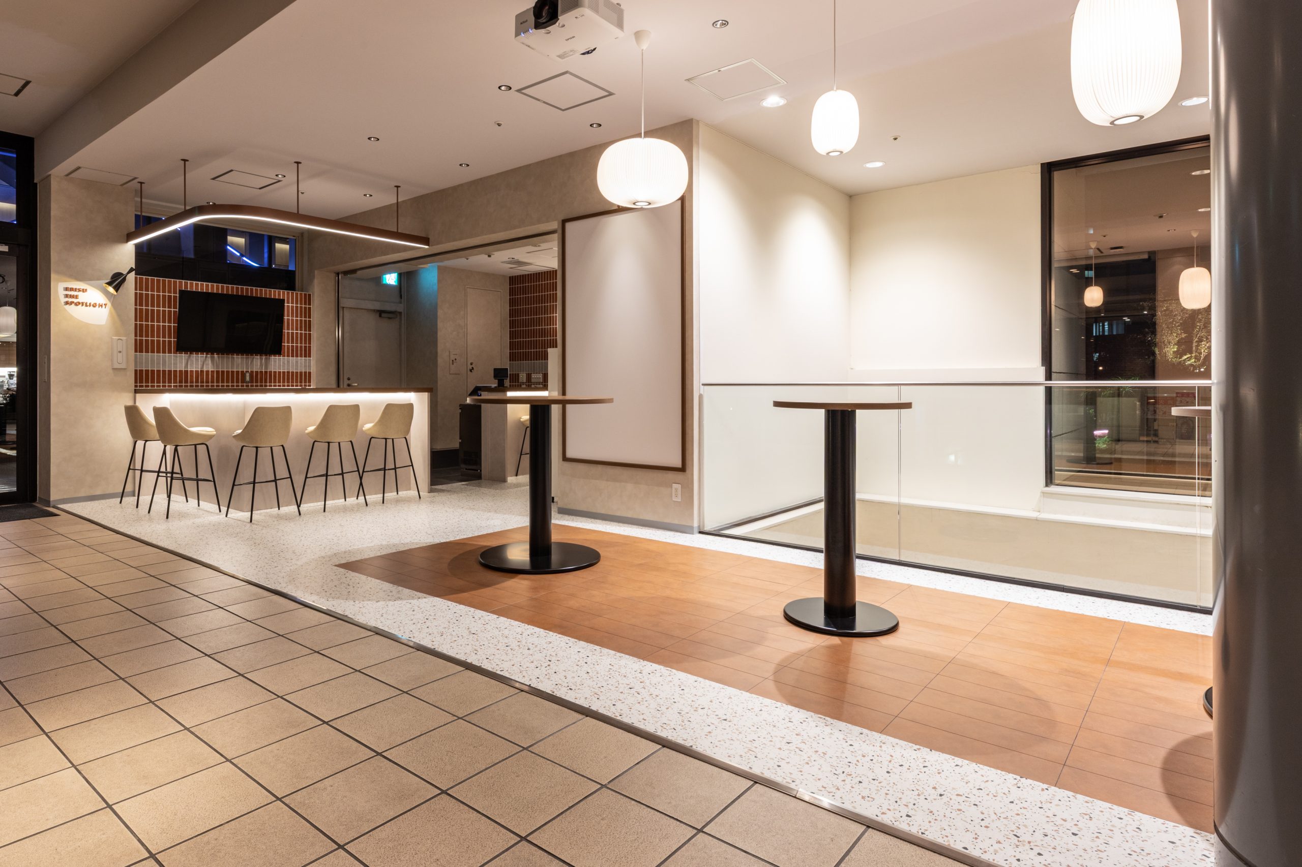 - Barカウンター、プロジェクター、音響設備、ハイテーブル、ホワイトボードなど